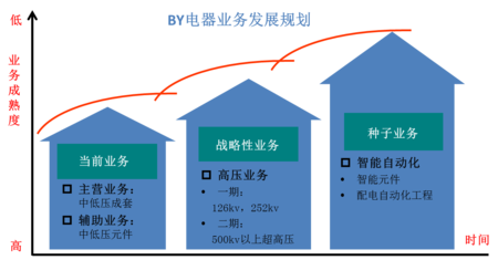 1、BY電器需以中低壓成套和中低壓元件為當前主營業務,并確立以高壓為戰略性業務,以智能自動化為種子業務的業務規劃,讓BY電器未來可持續性發展。
