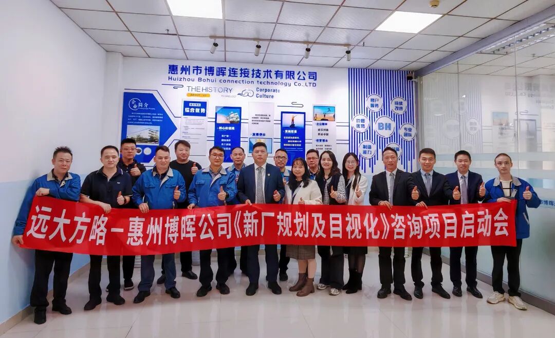 近日,惠州市博暉連接技術有限公司(以下簡稱“惠州博暉”)攜手遠大方略啟動《新工廠規劃及目視化》咨詢項目,該項目聚焦科學合理的生產線設計,將打破傳統生產模式束縛,實現生產流程的精準優化;通過高效的車間布局優化,減少物料搬運與人員走動距離,提升生產效率;導入先進智能倉儲系統,實現庫存的精準管控與快速周轉;同時優化生產物流,確保物料供應及時、準確,降低物流成本。全面助力企業降本增效、提升產品質量、縮短交付周期,為企業可持續發展注入強勁動力,開啟高質量發展新篇章。