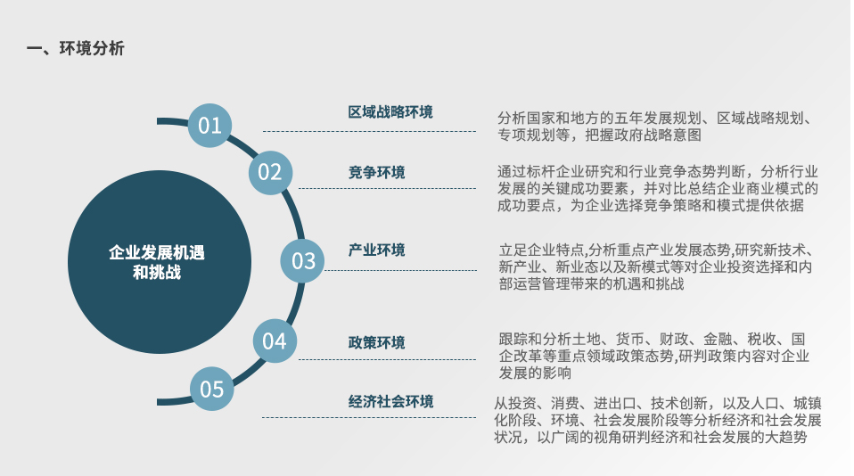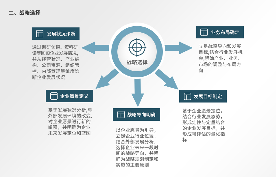 面對全球經濟不確定性的加劇與人口紅利的消退,中國經濟增長將從要素驅動與投資驅動,轉向創新驅動。為了應對未來我國經濟和社會發展的變化,尋求新的發展機遇,在市場競爭中占據優勢,企業需要準確研判區域戰略環境、政策環境、經濟社會環境、產業環境、競爭環境等,根據自身發展現狀,明確企業愿景、戰略導向、發展目標和業務布局方向,從商業模式、競爭策略、投資方向、資源獲取等方面規劃發展戰略,并為戰略落實構建合理的戰略保障體系。