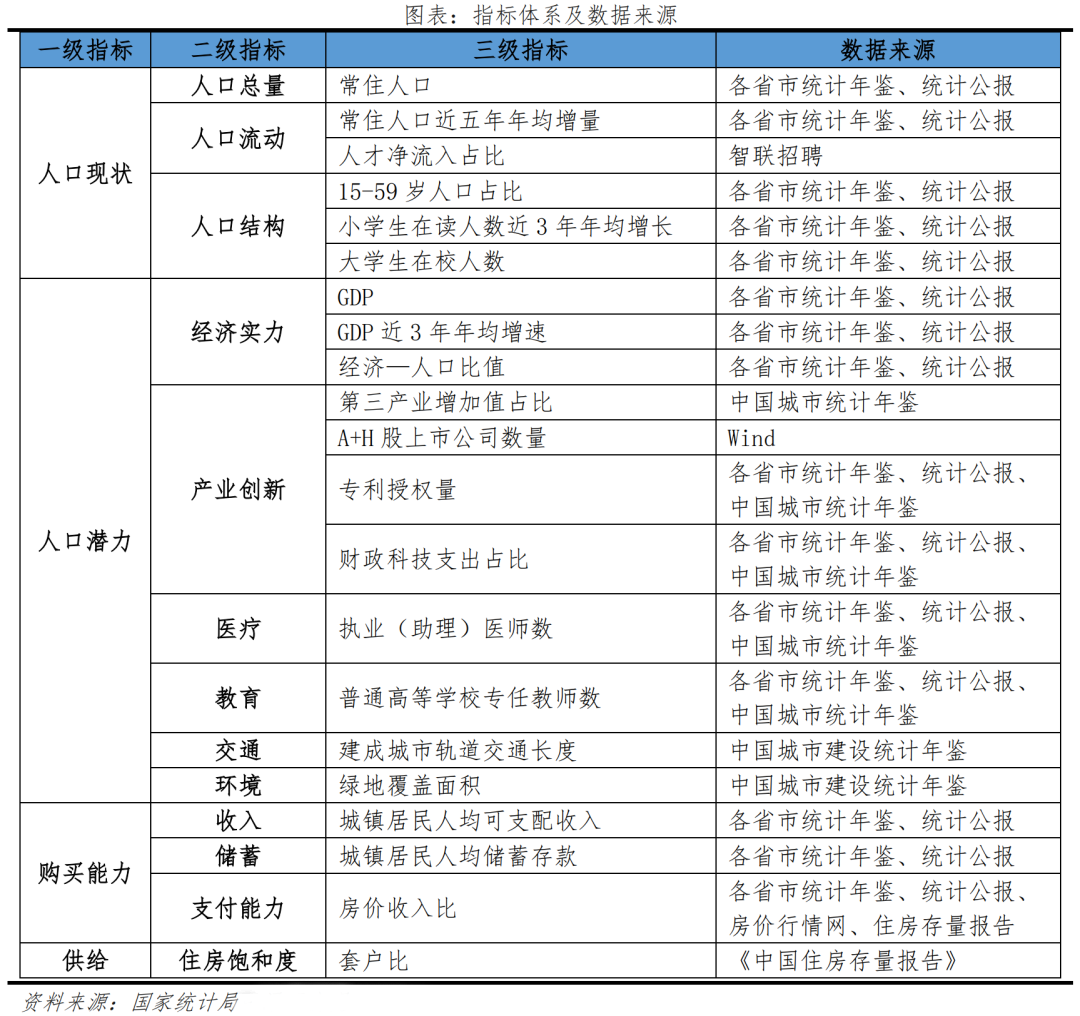 在數據選擇上,我們從“需求+供給”兩個層面建立基本面分析框架。需求側關注人口現狀、人口潛力以及人口購買能力,供給側關注區域住房存量情況,共涉及21個指標。