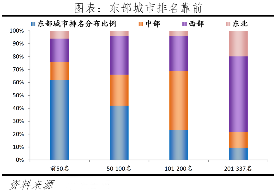 分四大區域看,榜單前50名中,東部、中部、西部、東北地區城市數量分別為31、7、9、3個,分別占區域城市數量的35%、9%、7%、8%,中西部潛力城市主要集中在成都、武漢、重慶、合肥、西安、長沙、鄭州等區域中心城市,東北地區僅核心城市沈長大躋身前50名。