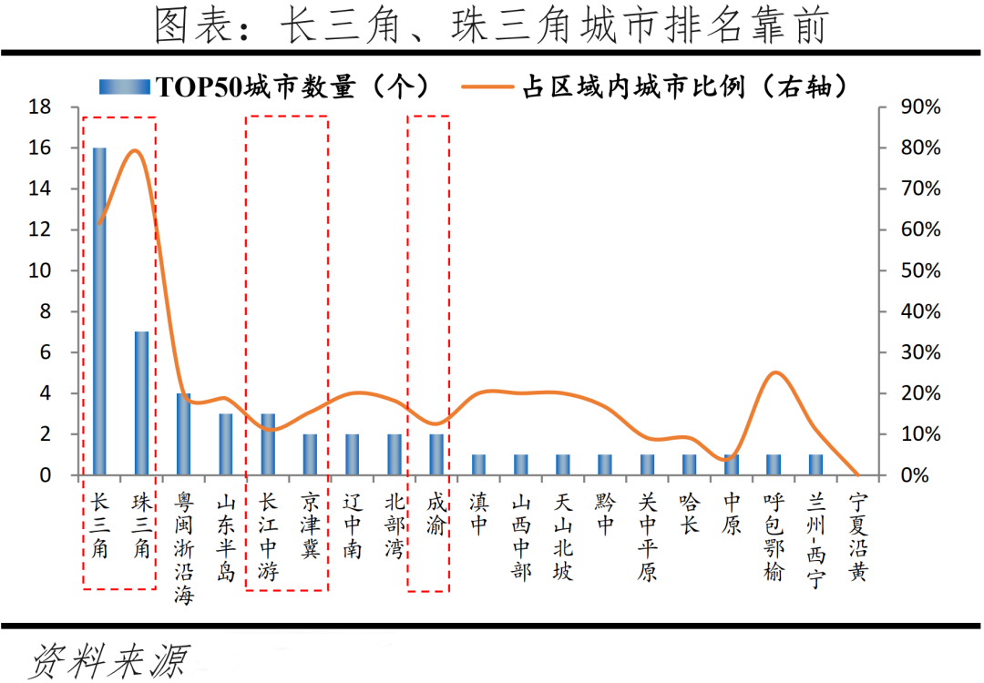 在發展潛力TOP50城中長三角、珠三角、京津冀、長江中游、成渝城市群內城市數量分別為16、7、2、3、2個,占區域城市總量比例分別為61.5%、77.8%、15.4%、11.1%、12.5%,長三角、珠三角城市群起步較早,發展相對成熟,資源集聚能力較強,區域城市總體排名靠前。
