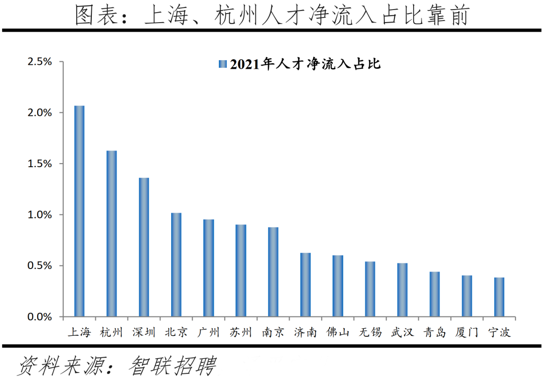 由于北京、上海近年嚴控人口,人口增量未進前十,但是人才凈流入指標依然領先,人才仍然傾向去大城市找工作。