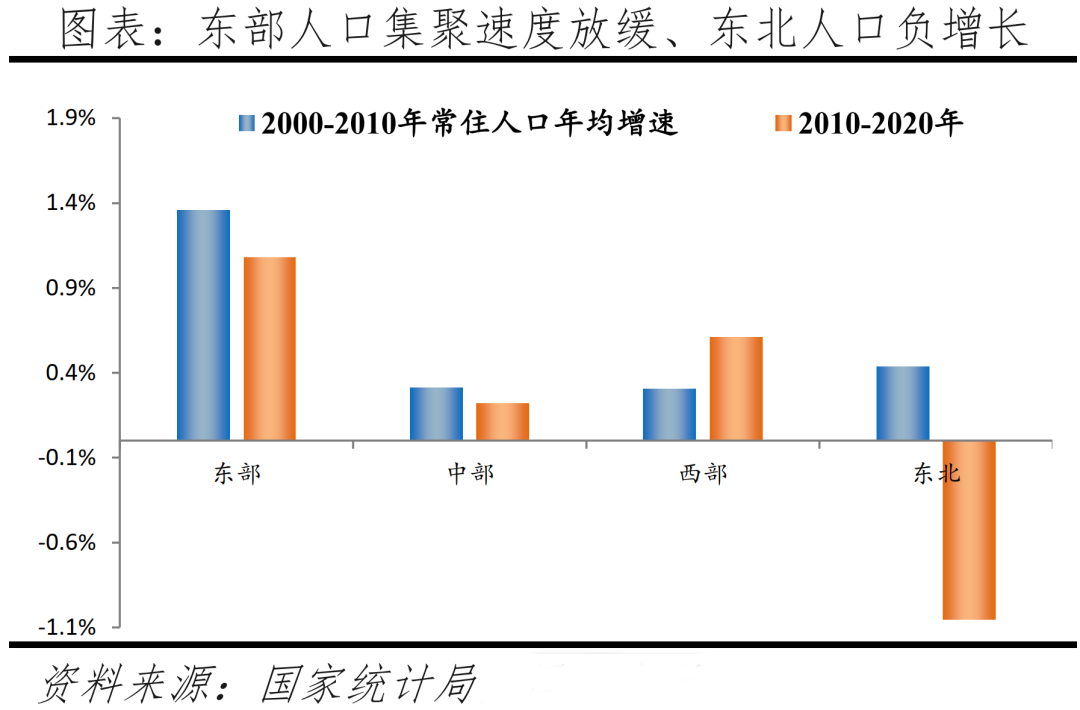 2010年以來,隨著沿海地區產業轉型升級、中西部地區產業承接以及老一代農民工老化,部分人口逐漸回流中西部,東部人口增速總體減緩,而東北地區人口開始負增長。