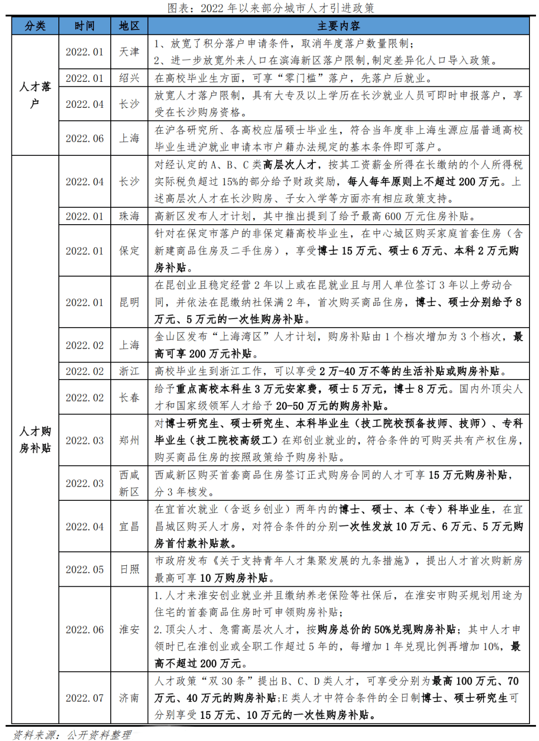 2017年初以來,各地掀起“搶人大戰”,城市人才競爭不斷升級,2022年以來各地人才政策不斷優化,包括放寬人才落戶政策、提供租購房補貼、創業補貼等,逐漸從“搶人”向“搶人才”轉變。