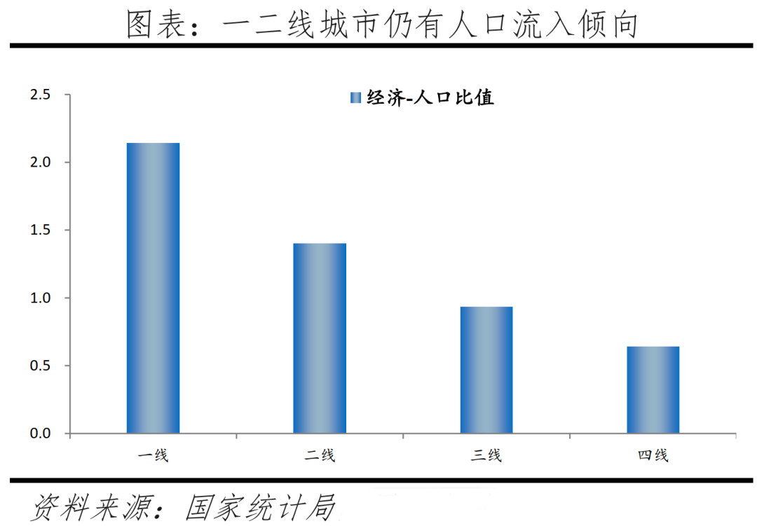 根據經濟-人口分布平衡法則,某地區經濟-人口比值大于1,人口有凈遷入趨勢;經濟-人口比值小于1,人口有凈遷出趨勢,所以一二線城市人口仍有凈流入傾向,而三四線城市人口有凈流出傾向。