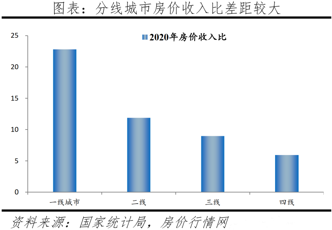 房價收入比方面,2020年一線、二線、三線、四線城市房價收入比分別為22.8、11.9、9.0、5.9,城市間分化顯著,這與全球其他經濟體核心城市房價收入比較高的情況一致。