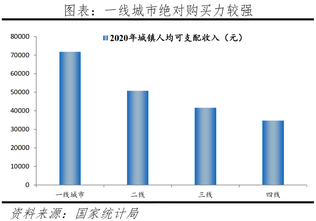 絕對購買力包括收入和存款,2020年一線、二線、三線、四線城鎮人均可支配收入分別為7.2、5.1、4.2、3.5萬元。