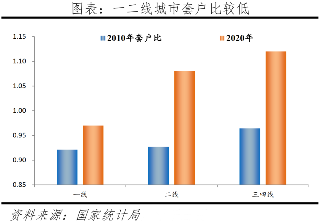 當前一二線住房供給偏緊,套戶比分別為0.97、1.08,中部和東北地區相對過剩,套戶比分別為1.10、1.13。