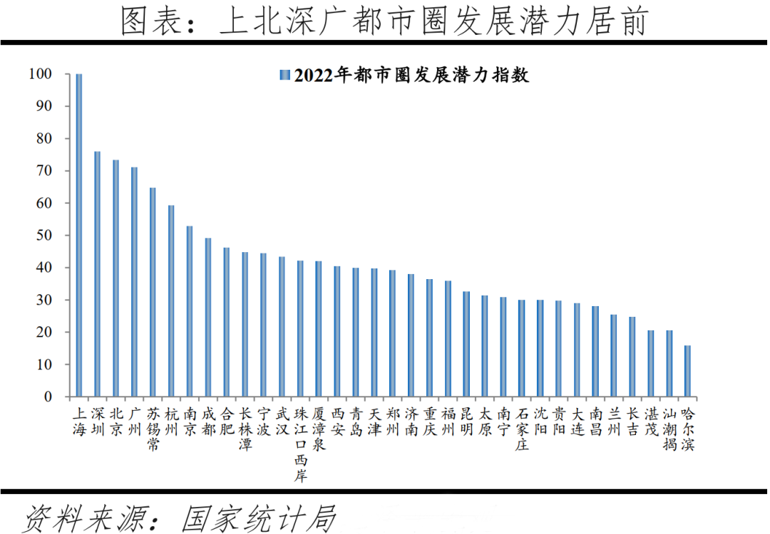 在都市圈層面,34個千萬級都市圈以18.6%的土地集聚63%的人口創造約78%的GDP,其中上海、深圳、北京、廣州等都市圈發展潛力居前。