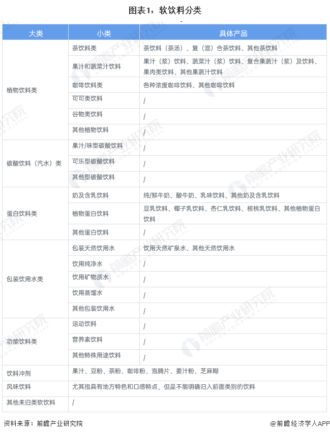 根據商務部2017年發布的行業標準《流通業商品分類與代碼——軟飲料》(SBT 11207-2017)中的定義,軟飲料(soft drink)是指酒精含量低于0.5%(質量比)的天然的或人工配制的飲料。