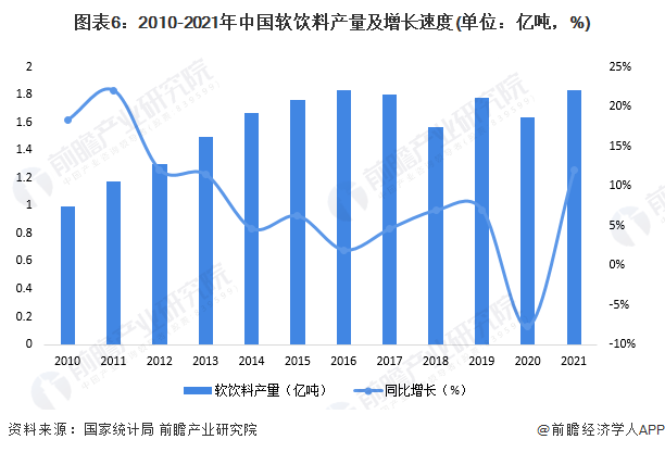國家統計局數據顯示,2010-2021年,我國軟飲料產品產量呈現增長趨勢,但增長速度總體波動下降。2017-2018年,我國軟飲料產量下滑,到2019年有所恢復,2019年我國軟飲料產量為1.78億噸,同比增長13.29%;2020年受疫情影響,軟飲料產量為1.63億噸;2021年我國軟飲料產量回升至1.83億噸,同比增長12%,回到與2016年相同的近十年高點水平。