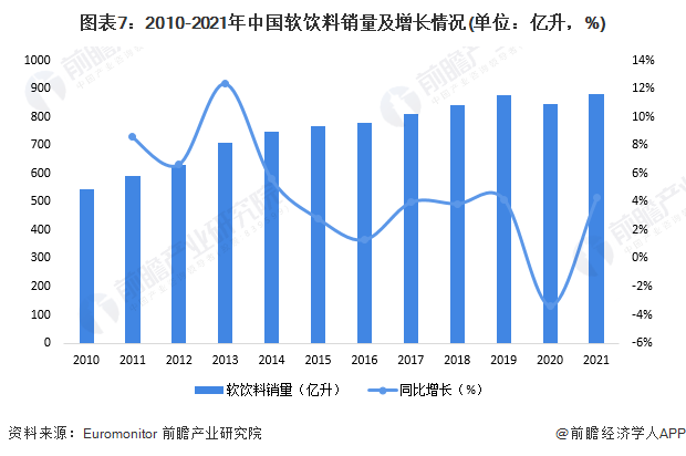中國作為全球第二大軟飲料市場,僅次于美國,近年來軟飲料需求不斷增長。根據Euromonitor的數據,2010-2021年,中國軟飲料銷量逐年上升,不過增速有所放緩。2020年疫情期間,大多數商店關門,由于居家隱居和禁止社交聚會,人們無法與親朋好友相聚和慶祝,軟飲料銷量下滑3.4%;2021年中國軟飲料銷量為883.05億升,同比增長4.3%。