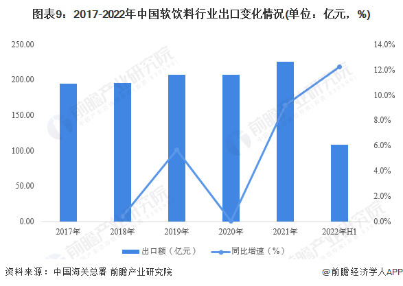 根據中國海關總署數據,2017-2021年,中國軟飲料出口金額持續上升。2020年受疫情影響,中國軟飲料出口增速降至最低,隨后在2021年增速快速回升至9.2%,2021年全年軟飲料出口金額達225.81億元。2022年上半年,中國軟飲料行業的出口規模達108.38億元,同比增長12.2%。