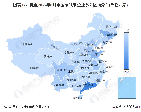根據中國企業數據庫企查貓,截至2022年8月下旬,中國軟飲料企業主要分布在廣東省。截至2022年8月下旬,廣東共有相關軟飲料企業數4746家,吉林有2378家,山東有2137家。