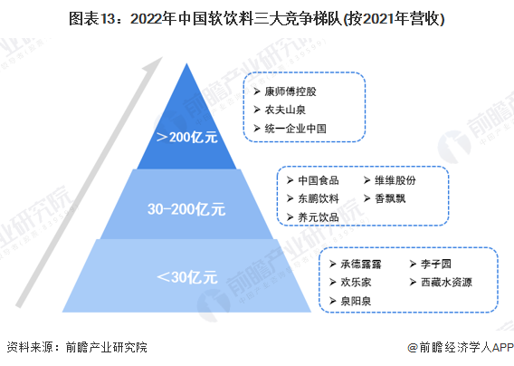 在快速發展過程中,中國軟飲料行業整體規模、品牌影響力不斷攀升。軟飲料行業依據企業在2021年的營業收入劃分,可分為3個競爭梯隊。其中,營業收入大于200億元的企業有康師傅控股、農夫山泉、統一企業中國;營業收入在30-200億元之間的企業有中國食品、東鵬飲料、養元飲品、維維股份、香飄飄等;其余企業的營業收入在30億元以下。