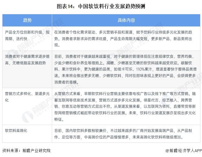 中國軟飲料行業在消費者個性化需求驅動、營銷手段和渠道多元化發展的大背景下,軟飲料產品生命周期大幅變短,更多新產品、新品類將出現;隨著消費者對于健康越來越重視,減糖、少糖甚至無糖的軟飲料越來越受歡迎。另外,從營銷方式上來看,綜藝植入、跨界營銷、創意互動等營銷方式和直播帶貨等新型網絡營銷模式將成為越來越多企業和品牌的選擇。