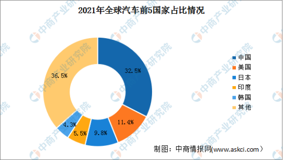 目前,中國已成為全球最大的汽車生產國。數據顯示,2021年中國汽車產量占世界總產量的32.5%;美國產量占比為11.4%,全球排名第二;此外,日本、印度和韓國的比重分別為9.8%、5.5%、4.3%,位列第3-5名。