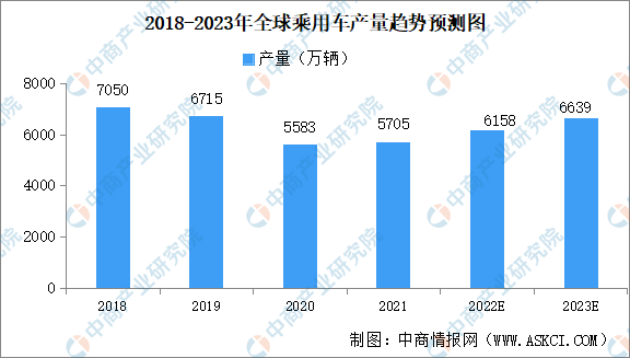 數據顯示,2018年至2020年全球乘用車產量呈現下滑趨勢,2021年隨著新冠肺炎疫情緩和,居民出行需求增加,乘用車產量出現增長,產量約為5705萬輛,同比增長2%。預計2022-2023年全球乘用車市場需求回暖加速,產量呈增長趨勢,到2023年全球乘用車產量將達6639萬輛。