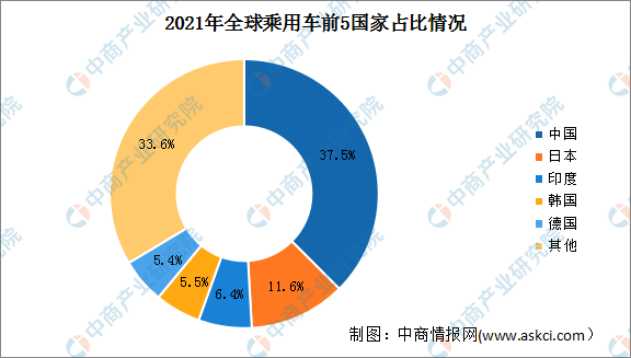 全球乘用車產量排在前5名的國家分別是中國、日本、印度、韓國和德國。其中,中國乘用車產量排名第一,占比高達37.5%,日本、印度、韓國和德國乘用車產量占比分別為11.6%、6.4%、5.5%和5.4%。