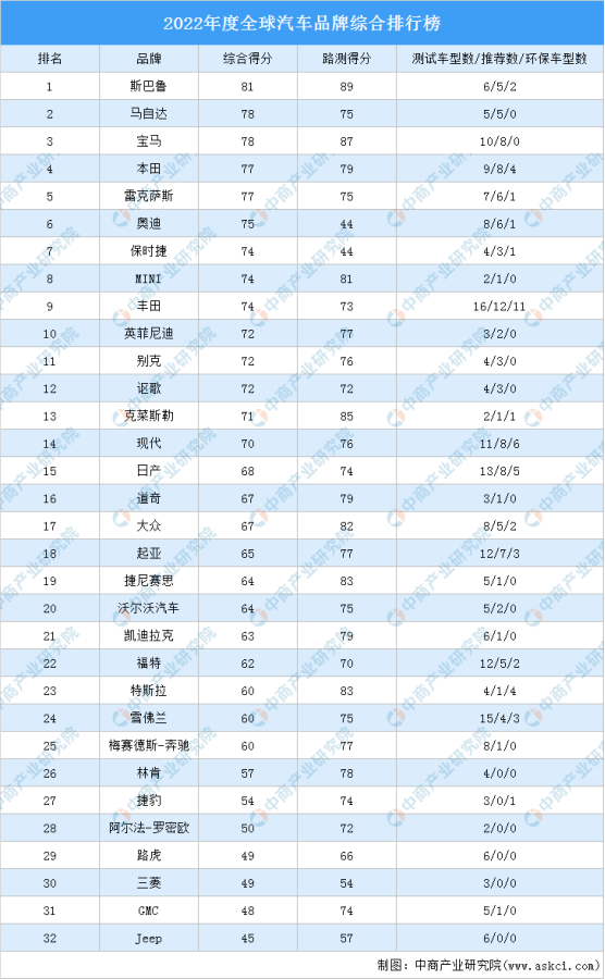 2022年度全球汽車品牌綜合排行榜基于道路測試、可靠性、客戶滿意度和安全性這四個因素對32個汽車品牌進行綜合考察。榜單顯示,斯巴魯位居榜首,馬自達和寶馬排名第二和第三,本田、雷克薩斯、奧迪、保時捷、MINI、豐田、英菲尼迪進入前十,依次排名第4-10名。