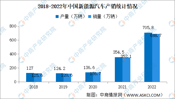 2022年12月,新能源汽車產銷繼續保持高速增長,再創歷史新高,分別達到79.5萬輛和81.4萬輛,同比均增長51.8%。2022年,新能源汽車產銷分別達到705.8萬輛和688.7萬輛,同比分別增長96.9%和93.4%。