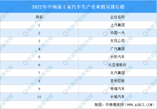 2022年,汽車銷量排名前十位的企業共銷售2314.8萬輛,占汽車銷售總量的86.2%。2022年前十家汽車生產企業分別為:上汽集團、中國一汽、東風公司、廣汽集團、長安汽車、比亞迪股份、北汽集團、吉利控股、奇瑞汽車、長城汽車。