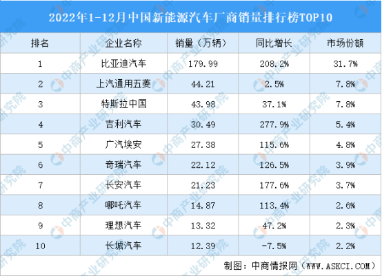 2022年1-12月,中國新能源汽車廠商銷量前十車型銷量合計409.98萬輛。其中,比亞迪汽車銷量最高達179.99萬輛,市場份額31.7%。上汽通用五菱、特斯拉中國排名第二和第三,銷量分別為44.21萬輛、43.98萬輛,市場份額均為7.8%。