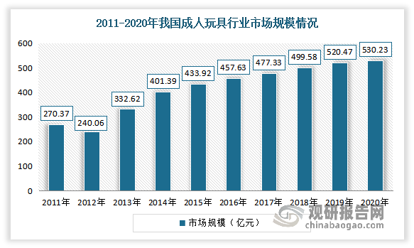 近年隨著我國經濟的發展和居民生活水平的提高,居民開始注重精神層面的追求,玩具消費的群體正在從兒童拓展到成年人,更多高檔、新穎的玩具逐漸成為成年人的消費首選,促使成人玩具消費規模迅速壯大。數據顯示,2020年我國成人玩具行業市場規模由2011年的270.37億元增長至530.23億元。