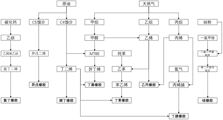 合成橡膠主要生產原料為丁二烯,原料端來看,第一種工藝路徑是從原油出發,通過石腦油裂解工藝獲得混合C4,并從中抽提丁二烯。第二種工藝路徑是從天然氣出發,通過乙烷制乙烯裂解裝置副產混合C4,并從中抽提丁二烯。除丁二烯外,合成橡膠生產原料包括苯乙烯、異丁烯、異戊二烯、丙烯腈等多種單體中間物。