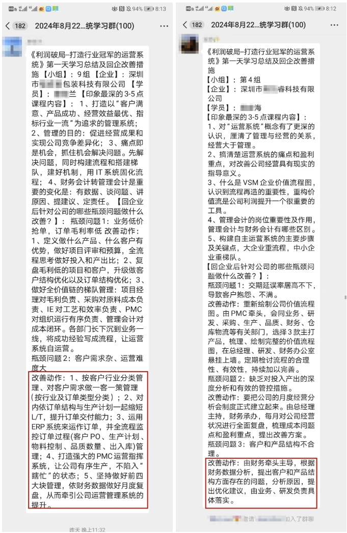 參加此次課程的學員近百人,來自不同行業不同企業的企業家、高管,更有部分企業組團前來學習,全員提升思維,助力企業增長。白天的高能課程讓企業受益匪淺,結束一天的課程之后,企業老板都自發的帶著自己的團隊留下來進行深度復盤,盤點企業的關鍵節點和可優化空間,真正做到學以致用,落地見效。